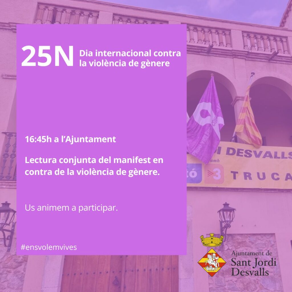 a les 16:45h davant de l’Ajuntament es realitzara una lectura conjunta del manifest del dia internacional contra la violència de gènere.