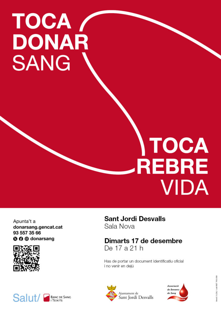 El proper 17 de desembre, la Sala Nova serà un punt de donació de Sang. Aquí trobareu tota la informació: