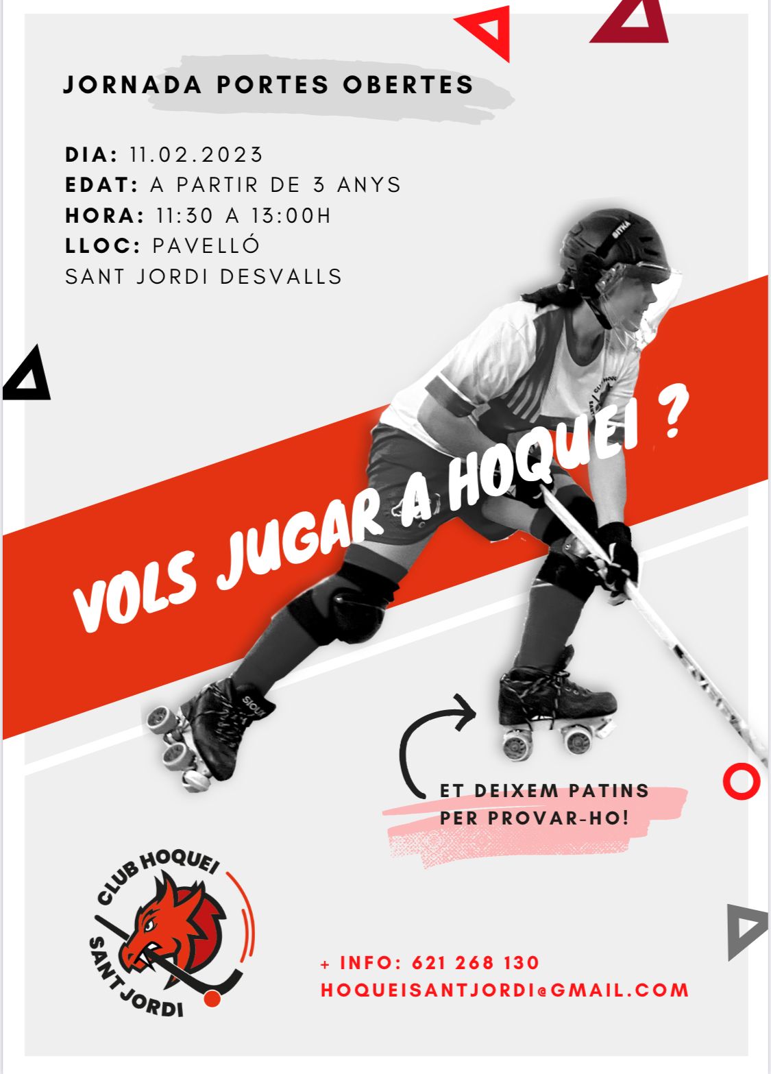 A jornada està adreçada a partir de 3 anys. Per a més informació podeu trucar al 621 268 130 o bé enviar un mail a hoqueisantjordi@gmail.com