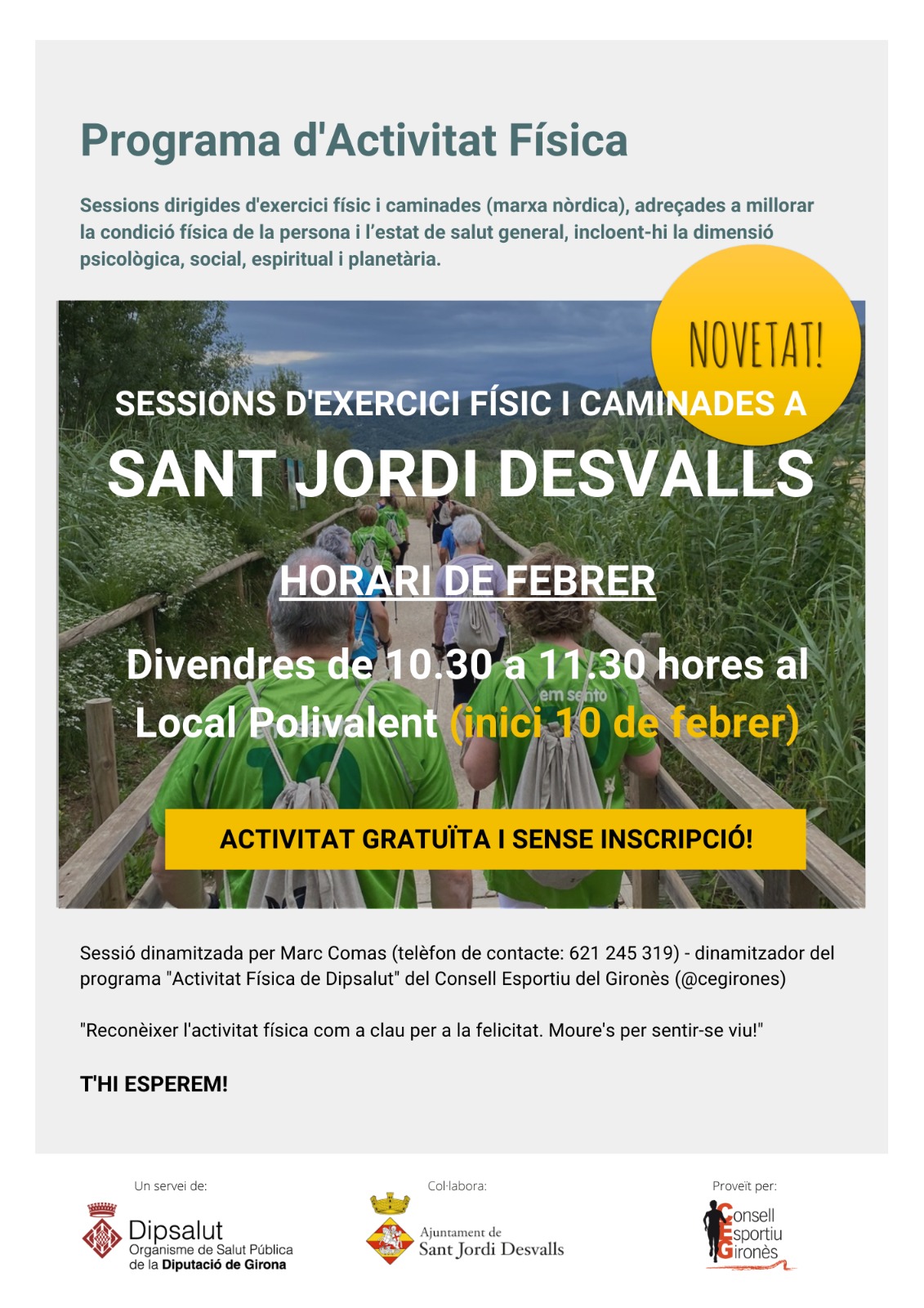 A partir del dia 10 de febrer, tots els divendres del mes de febrer teniu l’oportunitat de participar a les sessions d’exercici físic i caminades a Sant Jordi Desvalls.